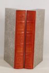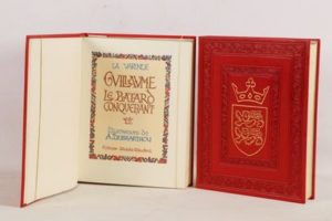 LA VARENDE (Jean de) - Guillaume le bâtard conquérant - Paris; Michèle Trinckvel, 1974 - 2 volumes In-folio - Illustrations in et hors texte et encadrement du texte en couleurs par André Dussarthou - Reliure de l’éditeur pleine basane cerise frappée à froid et ornée d’armes dorées aux centres des 1ers plats, emboîtages argentés bordés - Gardes argentées - Dos à petits nerfs ornés à l’identique, titrés et tomés or (passés uniformément) - Gardes argentées - Têtes dorées - Très bon exemplaire numéroté sur chiffon de Malmenayde (n°318 sur les 650, tirage total: 900).
