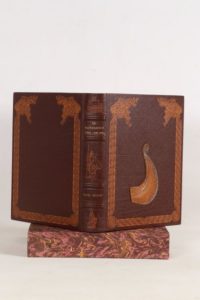 LANGLOIS (Lieutenant Colonel) - Les Normands vers l’an mil. Deux sagas islandaises - Versailles; Éditions du Rameau d’Or, 2003 - 1 volume In-folio - Illustrations et ornementations à chaque page, compositions hors texte rehaussées en couleurs au pochoir par Pierre Joubert - Reliure éditeur chagrin havane joliment encadrée d’1 décor viking fauve, 1er plat orné d’1 drakkar en relief, emboîtage bordé - Contre plats et gardes de soie bordeaux - Dos à nerfs orné d’1 bateau viking, d’1 guerrier et d’1 pièce d’échecs, titré or - Tête dorée - Très bon exemplaire numéroté (n°131 sur les 177, tirage total: 300 + quelques hors commerce).