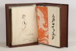 [LAO TSEU] - TAO-TÔ-KING - Le livre de la voie et de la vertu - Paris; Éditions d’Art du Rameau d’Or, 1992 - 1 volume In-folio en feuilles sous chemise rempliée titrée au 1er plat et étui de soie sauvage brune orné d’1 plaque émaillée décorée par l’artiste au 1er plat - Dos titré or en long - Traductions et notes critiques de J.-J.-L. Duyvendak - Texte illustré en filigrane et 12 aquarelles originales en couleurs hors texte à pleine page par Viêt-Hô, toutes avec cachet rouge de l’artiste - Très bon exemplaire nominatif numéroté sur japon nacré (n°4 sur les 10, tirage total: 81), avec 1 croquis d’étude à l’encre noire signé de l’artiste, 1 aquarelle originale supplémentaire sur japon nacré (sur la 2nde garde blanche) accompagnée d’1 envoi autographe signé de l’artiste et 1 suite des 16 dessins sur vélin d’Arches pur Chiffon - Superbe illustration de ce classique chinois.