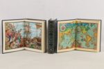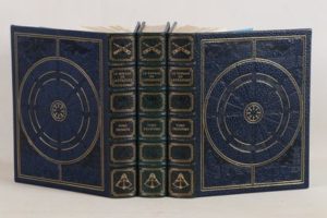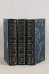 LAPEROUSE (Jean-François) - Le voyage extraordinaire de Lapérouse - Nice; Les Éditions Le Chant des Sphères, 1971-1972 - 3 volumes In-4° - Titres illustrés en couleurs et illustrations in et hors texte, rehaussées en couleurs au pochoir, certaines sur double page, par Da Ros, 1 carte dépliante couleurs - Texte encadré d’1 décor marin bleu, brun ou vert - Reliure éditeur chagrin maroquiné bleu, frappée à froid et ornée d’1 rose des vents turquoise, or et bleue aux plats - Dos à nerfs ornés, titrés et tomés or - Contre plats et gardes moirés de bleu - Têtes dorées - Certificat d’authenticité - Très bel exemplaire numéroté sur vélin.