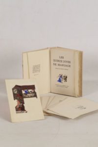 Les quinze joyes de mariage. Images de Henry Lemarié - Paris; Éditions du Rameau d’Or, sans date - 1 volume In-8° en feuilles, sous couverture rempliée illustrée couleurs au 1er plat, chemise titrée au dos (1er mors partiellement fendu) et emboîtage (partiellement fendu) - Illustrations miniaturistes in texte, rehaussées en couleurs au pochoir par Jean Gradassi - Bon exemplaire numéroté sur vélin d’Arches (n°22 sur les 30 de tirage de tête, tirage total: 750), avec 1 aquarelle originale et suite des illustrations en noir in fine.