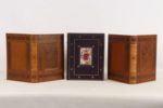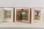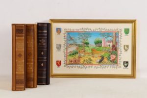 LORIS (Guillaume de) MEUNG (Jehan de) - Le roman de la Rose - Paris; Éditions de l’Ibis, 1981-1982 - 2 volumes petit In-folio - Frises en couleurs encadrant le texte et illustrations miniaturistes in et hors texte de Jean-François Mincet enluminées au pochoir, certaines sur double page - Reliures éditeur basane havane frappée d’1 riche décor à froid, sous emboîtages doublés moirés jaune - Dos à nerfs ornés à froid et titrés or (passés) - Têtes dorées - Très bel exemplaire numéroté sur vélin de Lana (n°150, tirage total: 890), avec certificat des enlumineurs et suites des illustrations en bistre en feuilles sous chemises papier à rabats et chemises demi-basane havane (dos passé) et moire jaune ainsi qu’1 planche encadrée avec envoi autographe signé de l’illustrateur - On y joint: Le roman de Renart ou les aventures de maître Renart et d’Ysengin son compère - Paris; Éditions de l’Ibis, 1989 - 1 volume In-folio - Vignettes en bistre in texte et compositions in et hors texte enluminées en couleurs au pochoir par Max-Roger Guéguen - Reliure éditeur basane violette frappée d’1 riche encadrement à froid et or, plaque émaillée illustrée en couleurs incrustée au 1er plat, sous emboîtage doublé moiré rose - Dos à nerfs orné or et à froid, titré or - Tête dorée - Très bel exemplaire numéroté sur vélin de Lana (n°67 sur les 100, tirage total: 575) avec certificat des enlumineurs et suite des illustrations au trait en feuilles sous chemise papier à rabats et chemise demi-basane violette et moire rose ainsi qu’1 planche encadrée en couleurs signée de l’illustrateur.