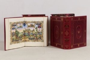 MICHELET (Jules) - François Ier - Monte Carlo; Éditions Arts et Couleurs, collection Les Grands Rois de France, 2001 - 2 volumes In-4° - Texte encadré d’1 frise bleue - Illustrations miniaturistes in et hors texte rehaussées en couleurs et or au pochoir de Dominique Pardigon - Reliure éditeur chagrin maroquiné prune sous emboîtages bordés - Plats encadrés de filets dorés et ornés de scènes frappées à froid et or d’après l’artiste - Contre plats et gardes de moire bordeaux - Dos à nerfs ornés à l’identique titrés et tomés or - Têtes dorées - Très bon exemplaire numéroté sur Vélin d’Arches (n°235 sur les 400, tirage total: 520 + 20 hors commerce) - Certificat d’éditeur.