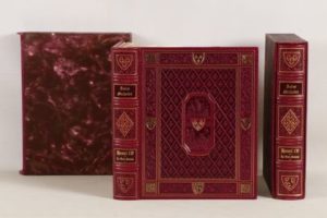 MICHELET (Jules) - Henri IV le Vert Galant - Monte Carlo; Éditions Arts et Couleurs, collection Les Grands Rois de France, 1999 - 2 volumes In-4° - Texte encadré d’1 frise bleue - Illustrations miniaturistes in et hors texte rehaussées en couleurs et or au pochoir de Dominique Pardigon - Reliure éditeur chagrin maroquiné prune sous emboîtages bordés - Plats encadrés de filets dorés et ornés de scènes frappées à froid et or d’après l’artiste - Contre plats et gardes de moire bordeaux - Dos à nerfs ornés à l’identique titrés et tomés or - Têtes dorées - Très bon exemplaire numéroté sur Vélin d’Arches (n°221 sur les 650, tirage total: 830 + 25 hors commerce) - Certificat d’éditeur.