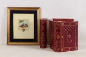 MICHELET (Jules) - Louis XIII et Richelieu - Monte Carlo; Éditions Arts et Couleurs, collection Les Grands Rois de France, 1983 - 2 volumes In-4° - Texte encadré d’1 frise violete - Illustrations miniaturistes in et hors texte rehaussées en couleurs et or au pochoir de Jean Gradassi - Reliure éditeur chagrin maroquiné prune sous emboîtages bordés - Plats encadrés de filets dorés et ornés de scènes frappées à froid et or d’après l’artiste - Contre plats et gardes de moire bordeaux - Dos à nerfs ornés à l’identique titrés et tomés or - Têtes dorées - Très bon exemplaire numéroté sur Vélin d’Arches (n°532 sur les 300, tirage total: 1700 + 30 hors commerce) avec 1 illustration en couleurs sur parchemin encadrée et 1 suite du trait en garance foncé des illustrations hors texte - Certificat d’éditeur.