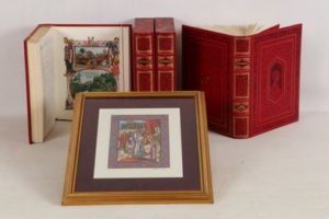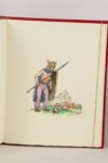 MONTESQUIEU - De l’esprit des lois - Nice; Éditions d’Art Sefer, Monte Carlo; Éditions Arts et Couleurs, 1990 - 4 volumes In-4° - Illustrations couleurs au pochoir in et hors texte de Da Ros - Reliure éditeur plein cuir rouge frappée d’1 riche décor à or et à froid, sous emboîtages doublés - Contre plats et gardes de moire rouge - Dos à nerfs frappé à froid, ornés, titrés et tomés or - Têtes dorées - Très bel exemplaire numéroté (n°302 sur les 300, tirage total: 1550), avec 1 illustration originale signée par Da Ros en couleurs in fine du tome IV, 1 suite en bistre des in et hors texte reliée in fine de chaque volume et 1 illustration en couleurs signée et encadrée.