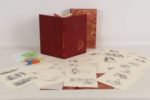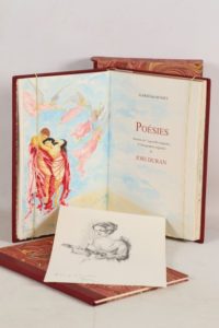 MUSSET (Alfred de) - Poésies - Sans lieu; Éditions Carrés d’Art, 2011 - 1 volume In-4° - 7 aquarelles originales hors texte signées de la main de l’artiste et 32 lithographies originales in texte tirées en noir par Jori Duran - Reliure éditeur chagrin bordeaux sous emboîtage bordé - Portrait de Musset doré au 1er plat - Dos à nerfs titré or - Tête dorée - Très bel exemplaire sur vélin d’Arches lettré F (sur les 7, tirage total: 40 + quelques hors commerce) avec 1 dessin original signé ayant servi à l’élaboration d’1 aquarelle, 1 suite signée des bandeaux et culs-de-lampe en noir, et enrichi d’1 aquarelle de projet signée, le tout sous portfolio demi-chagrin bordeaux.
