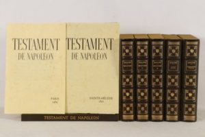 NAPOLÉON - Mémoires. Lettres intimes. Correspondance officielle. Testament - Paris; Club du Livre, Philippe Lébaud, 1969 - 6 volumes In-4° - Ornementations typographiques de Louis Ferrand, lithographies originales en couleurs, certaines sur double page, de Jean-François Debord, Yves Brayer, Fontanarosa, Michel Ciry, Edy Legrand, Chapelain-Midy et Mac’Avoy - Reliure éditeur cuir brun sous emboîtages bordés pour les 5 premiers volumes - Large dentelle d’encadrement fleuronnée et armes centrales dorées de l’Empereur - Dos à nerfs orné et titrés or (tomés pour les 3 premiers volumes) - Têtes dorées - Le volume intitulé Testament est constitué de 2 parties en feuilles sous chemises titrées, sous étui demi-cuir brun titré or au dos, l’1 en fac-similé du manuscrit original rédigé par l’empereur, l’autre la transcription imprimée - Très bons exemplaires numérotés sur vélin.