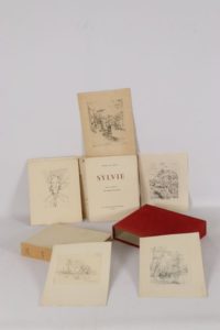 NERVAL (Gérard de) - Sylvie - Sans lieu; Les Pharmaciens Bibliophiles, 1962 - 1 volume In-4° en feuilles sous couverture rempliée sur Auvergne à fleurs incrustées, chemise titrée au dos (assombri et auréolé), et emboîtage de suédine rouge - Gravures originales in et hors texte de Jean-Pierre Blanchet - Très bon exemplaire nominatif et numéroté sur vélin du Marais (n°116 sur les 180), avec 2 dessins originaux à part signés, 1 suite en 1er état numérotée 7/10, 1 suite en état définitif numérotée 7/15, et 1 menu des Pharmaciens Bibliophiles signé de Blanchet (roussi).