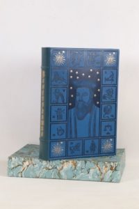 NOSTRADAMUS - Les oracles de Michel de Nostredame dit Nostradamus - Paris; Les Éditions du Grimoire, [1984] - 1 fort volume In-folio - Texte orné de lettrines, calligraphié par Pierre Aubery - 12 lithographies originales signées en couleurs sur double page de Claude Chevalley - Reliure éditeur basane bleu nuit ornée d'1 portrait frappé à froid entouré d’1 semis d’étoiles dorées et de compositions dorées et à froid au 1er plat, sphère armillaire frappée au 2nd plat - Contre plats et gardes de moire bleu pâle - Dos à nerfs titré or et noir en légèrement passé) - Tête dorée - Très bel exemplaire numéroté sur vélin d’Arches (n°398 sur les 1500).