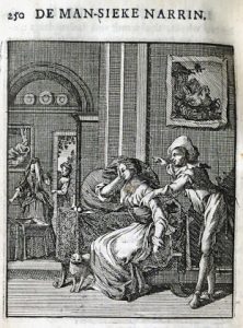 De "vrouwelijke tegenhanger" van het moraliserend werk "De gekheydt der wereldt" waarin de Duits-Oostenrijkse augustijner prediker (1644-1709) op satirische wijze 50 menselijke gedragingen en zwakheden aan de kaak stelt (1ste uitg. : 1718 ?). Op dezelfde wijze worden in dit werk 50 typische ondeugden van vrouwen belicht ("de toverzieke narrin", "de lekkerbekkige narrin", "de dronke narrin" ...), geïllustreerd met 2 frontispices en 50 koperprenten, telkens vergezeld door een drievoudig distichon en een uitgebreide toelichting. # niet in Landwehr LC, Praz, Visser, EBL. ^ Pendant féminin du "De gekheydt der wereldt", illustré de 2 frontispices et de 50 in texto (qqs pet. défauts). Plein veau de l'ép. (lég. frotté).