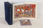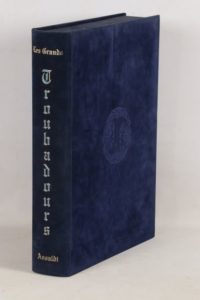 PARDO (Joseph, traducteur) - Les grands troubadours - Nice; Sefer, 1981 - 1 fort volume In-folio en feuilles, sous chemise bleu ciel muette rempliée, dans étui éditeur en suédine marine avec marque de l’éditeur frappée à froid au 1er plat et titré en long au dos - Texte encadré d’1 large frise en couleurs, vignettes in texte dorées et nombreuses illustrations rehaussées en couleurs au pochoir à pleine page d’Ansaldi - Très bel exemplaire numéroté sur vélin d’Arches (n°822 sur les 1540, tirage total : 2000), enrichi d’1 grand dessin original à l’aquarelle signé et numéroté et d’1 envoi autographe signé de l’artiste.