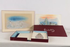 [RELIGIOSA] - Le cantique des cantiques - Bièvres, Pierre de Tartas, 1977 - 1 volume In-folio en feuilles sous couverture de feutre marine rempliée et ornée d’1 nu au 1er plat, emboîtage toilé violet avec signature fac-similée de l’illustrateur au 1er plat - 17 lithographies originales couleurs de Chapelain-Midy - Chaque cantique est constitué d'1 grand feuillet replié en triptyque avec texte en français sur la page de gauche, le texte en hébreu sur celle de droite et l'illustration lithographiée en leur centre - Très bon exemplaire signée par l’artiste et numéroté sur japon nacré lettré (C sur les 7, tirage total: 306 + quelques hors commerce), avec la gouache originale de l’1 des triptyques, avec le bon à tirer de la lithographie correspondante signé par l’artiste et, dans 1 carton à dessin 1 double suite des 8 triptyques, l’1 sur japon signée par l’artiste et l’autre sur grand vélin de Rives.