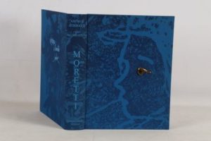 RIMBAUD (Arthur) - Les illuminations - Paris; Georges Israël, 1981 - 1 volume In-folio en feuilles sous chemise cartonnée turquoise, et étui toilé bleu et marine orné, avec pièce métallique dorée au 1er plat représentant 1 œil, titré en bleu au dos - 16 compositions originales lithographiées, toutes signées au crayon, sur double page, la majorité en couleurs, les autres monochromes, de Raymond Moretti - Très bel exemplaire numéroté sur vélin de Rives (n°IX sur les 20, tirage total: 298), manque le dessin et la suite sur vélin de Rives.