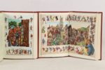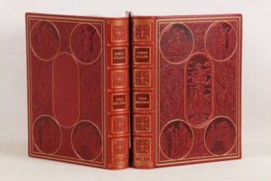 ROLLAND (Romain) - Colas Breugnon - Paris; Éditions Plaisir du Livre, 1973 - 2 volumes In-4° - Texte encadré d’1 frise bleue, nombreuses illustrations in et hors texte rehaussées en couleurs au pochoir par Ansaldi - Reliure éditeur chagrin maroquiné framboise sous emboîtages bordés - 1ers plats encadrés de filets dorés et richement frappés de décors à froid - Dos à nerfs titrés et ornés or et à froid - Contre plats et gardes doublés de moire rose - Têtes dorées - Très bel exemplaire numéroté sur vélin BFK de Rives - Certificat d’éditeur.