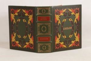 ROSTAND (Edmond) - L’aiglon - Paris; Éditions d’Art Les Heures Claires, 2006 - 1 fort volume grand In-8° - 16 illustrations de Yvonne Valpré Debauvais, dessins et ornements de Dominique Büki - Belle reliure éditeur chagrin repoussé vert mosaïquée de motifs floraux en couleurs par la Reliure d’Art du Centre à Limoges en hommage à Marius Michel, emboîtage bordé - Dos à nerfs orné de fers dorés avec pièces de titre bordeaux - Tête dorée - Très bel exemplaire numéroté sur vélin de Rives (n°268 sur les 450, tirage total : 664 + quelques hors commerce).