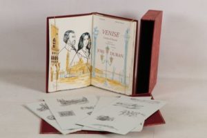SAND (George) MUSSET (Alfred de) - Venise. Lettres d’amour - Sans lieu; Éditions Carrés d’Art, 2004 - 1 volume In-4° - 8 aquarelles originales hors texte en couleurs, de la main de l’artiste et signées au crayon et 33 dessins in texte en couleur par Jori Duran - Reliure éditeur chagrin bordeaux sous emboîtage bordé - 2 personnages vénitiens dans médaillon doré au 1er plat - Contre plats et gardes doublés de moire framboise - Dos à nerfs titré or - Tête dorée - Très bel exemplaire numéroté sur vélin de Rives (n°12 sur les 20), avec 1 suite signée des bandeaux et culs-de-lampe, sous portfolio demi-chagrin bordeaux.