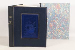 TURPIN (Philippe) - Voile des Mascareignes. La Réunion (1611-1815). Maurice - Rodrigue (1598-1815) - Cilaos; L’auteur, 1992 - 1 volume In-folio - Gaufrage sur 2 gardes blanches et sur 1 page par Alice Turpin, et 25 aquatintes à pleine page, 3 en double page, 5 vignettes et nombreuses lettrines, le tout tiré en bleu de Prusse par Philippe Turpin illustrant les textes de différents auteurs - Reliure éditeur chagrin marine sous emboîtage bordé - 1er plat encadré de filets or et bleu avec encadrement central dans lequel figure 1 vaisseau frappé à froid - Filet doré d’encadrement au 2nd plat - Dos lisse titré or - Tête dorée - Édition très soignée en très belle condition numérotée sur vélin d’Arches (n°37 sur les 100 de tirage de tête, tirage total: 150 + 50 hors commerce), avec signature de l’artiste à la justification.