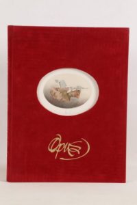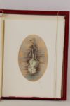 VATELOT (Étienne) LOUÉDIN (Bernard) - Opus - Paris; Michèle Broutta, 1997 - 1 volume In-folio en feuilles sous couverture rempliée avec titre frappé à froid au 1er plat, et étui de suédine bordeaux titré or au 1er plat et au dos avec fenêtre transparente ovale au 1er plat laissant apparaître 1 eau-forte signée en couleurs - Porte-folio conçu et réalisé en hommage à la musique illustré de 6 eaux-fortes originales en couleurs hors texte signées deBernard Louédin- Très bon exemplaire numéroté sur japon nacré (n°49 sur les 60, tirage total: 66 + 6 hors commerce) avec l’eau forte supplémentaire en frontispice.