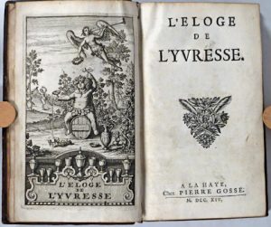 (Gastronomie & Oenologie) - [SALLENGRE, Albert-Henri de].- L'Éloge de l'yvresse. La Haye, Pierre Gosse, 1714. In-12° : frontisp.-[3]-216-[4] pp. (qqs coins de pages pliés). Rel. de l'époque : plein veau, dos fleuronné doré à nerfs (manque au...