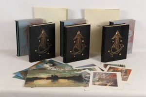VERLAINE (Paul) - Œuvres poétiques - Sans lieu; Éditions de l’Odéon, 1980 - 3 volumes In-4° - Illustrations couleurs ou en noir hors texte de Jean-Baptiste Valadié, certaines dépliantes - Reliure éditeur chagrin marine orné or aux 1ers plats, sous emboîtages bordés illustrés en sanguine - Dos à nerfs titrés et tomés or - Têtes dorées - Très bon exemplaire numéroté sur vélin de Malmenayde (n°49 sur les 150, tirage total: 1500 + 20 hors commerce), avec la suite des illustrations en couleurs et envoi autographe signé de l’artiste au crayon au faux titre du dernier volume.