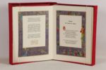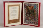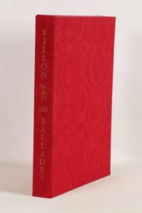 VILLON (François) - Les ballades de Maistre François Villon - Nice; Le Chant des Sphères, 1967 - 1 volume In-folio en feuilles, sous chemise rouge à rabats titrée au 1er plat et étui de moire rouge titré or en long au dos - Texte encadré de larges ornementations or et couleurs et nombreuses illustrations miniaturistes hors texte à l’identique, certaines à pleine page, par Ansaldi - Très bon exemplaire numéroté sur pur chiffon BFK de Rives (n°678 sur les 988, tirage total: 1250), enrichi d’1 dessin original à l’aquarelle signé d’Ansaldi - Certificat de l’éditeur sur papier japon.
