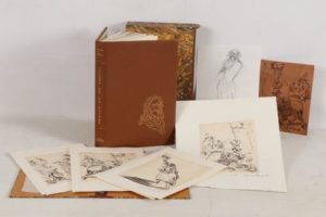VOLTAIRE - Éloge de la raison - Sans lieu; Éditions Carrés d’Art, 2009 - 1 volume In-4° - 18 lithographies in texte en bistre et 7 pointes-sèches hors texte signées de Weisbuch - Reliure éditeur chagrin havane sous emboîtage bordé - Portrait de Voltaire doré au 1er plat - Contre plats et gardes doublés de moire ivoire - Dos à nerfs titré or - Tête dorée - Très bel exemplaire, seul dénommé exemplaire d’artiste (tirage total: 80 + quelques hors commerce) et enrichi, sous portfolio demi-chagrin havane, d’1 suite des 7 pointes-sèches signées et d’1 dessin original signé de l’artiste, avec1 B.A.T. et 1 cuivre gravé.