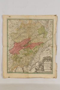 [CARTE GÉOGRAPHIQUE] - HOMANN (Jean-Baptiste) - Comitatus Burgundiae Tam in Primarias Ejus Praefecturas […] - Nuremberg; J.-B. Homann, [1715] - 1 carte gravée en coloris d’époque de la Franche-Comté en feuille - 64,50x 56 cm - Marques de pliures, déchirures marginales sans manque, 1 petite auréole en bas à gauche - Bon état.