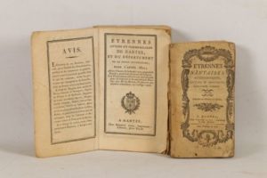 Ensemble de 2 volumes brochés - Étrennes nantaises ecclésiastiques, civiles et nautiques pour l’année commune 1770 - Nantes; Veuve Vatar, [1770] - 1 volume In-18° (1ère de couverture manquante, quelques feuillets écornés) - LE BOYER - Étrennes civiles et commerciales de Nantes, et du Département de la Loire-Inférieure, pour l’année 1821, […] - Nantes; Busseuil, [1821] - 1 volume In-16° sous couverture d’attente muette (légèrement épidermée) - Bel intérieur.
