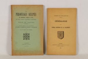 Ensemble de 2 volumes In-8° brochés - BELLEVÜE (Comte de) - Généalogie de la famille Mouëssan de la Villirouët - Nantes; Imprimerie Émile Grimaud et Fils, 1901 - 1 volume sous couverture rempliée avec armoiries gravées au 1er plat - Bon exemplaire - WISMES (Gaëtan de) - Les personnages sculptés des monuments religieux et civils, des rues, places, promenades et cimentières de la ville de Nantes. Du petit nombre de ceux qui existent, de quelle manière on devrait l’accroître - Vannes; Librairie Lafolye, 1898 - 1 volume non coupé (manques au dos).