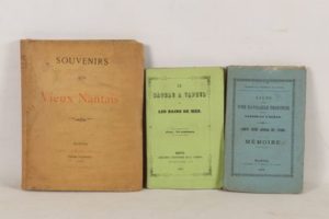 Ensemble de 3 volumes brochés - [CAILLO (Jean-Charles)] - Le bateau à vapeur et les bains de mer - Nantes; Forest, 1845 - 1 volume In-16° - Carte frontispice dépliante de la Loire-Inférieure, vignette au titre - Édition originale - CHAMBRE DE COMMERCE DE NANTES - Étude d’une voie navigable profonde entre Nantes et l’océan. Compte-rendu général des études. Mémoire - Nantes; Imprimerie du Commerce, Ev. Mangin, 1867 - 1 volume In-16° - [BRUNSCHWICG (Léon)] - Souvenirs d’un vieux Nantais1808-1888 - Nantes; Vier, 1889 - 1 volume petit In-8° sous couverture rempliée ((légèrement salie) - Quelques rousseurs éparses - 3 gravures hors texte et 1 gravure in texte en noir, des reproductions d'affiches et de documents in et hors texte en noir - Ex-libris manuscrit et dessin au titre - Édition originale peu courante.