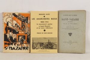 Ensemble de 3 volumes sur Saint-Nazaire - KERVILLER (René) - Un chapitre inédit de l’histoire de Saint-Nazaire (Loire-Inférieure) du XVe au XVIIIe siècle - Nantes; Imprimerie Vincent Forest et Émile Grimaud, 1876 - Bon exemplaire - [COLLECTIF] - Chambre de Commerce de Saint-Nazaire. Le port de Saint-Nazaire. Renseignements généraux sur la région. Année 1930 - Saint-Nazaire; Imprimerie du Courrier, [1930] - 1 volume In-8° broché sous couverture illustrée couleurs par l’artiste Seiz Breur René-Yves Creston au 1er plat (petites fentes partielles aux mors, petit manque en bas de dos) - Des illustrations in texte, grand plan de Saint-Nazaire dépliant in fine - HAZO (Bernard) - Les anarchistes bleus 1880-1914. Le mouvement ouvrier à Saint-Nazaire et en Loire-Inférieure - La Baule; Éditions des Paludiers, 1980 - 1 volume In-8° broché sous couverture illustrée d’1 vignette au 1er plat - Quelques illustrations in texte - Très bon exemplaire.