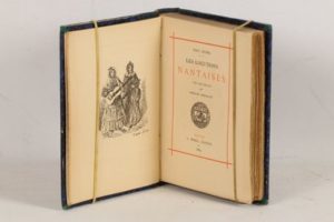 EUDEL (Paul) - Les locutions nantaises - Nantes; A. Morel, 1884 - 1 volume In-16° - 1 frontispice gravé d’après Girin (les sœurs Amadou, chanteuses de rue nantaises), et 26 lettrines à pleine page par Arcos, 1 par lettre de l’alphabet - Texte encadré de rouge - Reliure de l’époque demi-chagrin repoussé bleu - 1ère couverture conservée - Dos lisse orné et titré or - Bon exemplaire en édition originale numérotée sur papier teinté fort (264 sur 300, tirage total 361).
