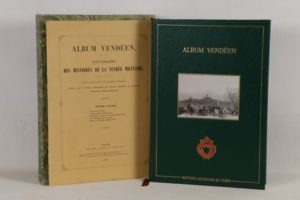 LEMARCHAND (Albert) - DRAKE (T.) - Album vendéen. Illustrations des histoires de la Vendée militaire - Sans lieu; Éditions Les Sillons du Temps, 1991 (reprint de l’édition d’Angersà l’Imprimerie et Librairie de Lainé Frères, 1856) - 1 volume In-folio - 125 planches par Thomas Drake - Reliure éditeur skyvertex vert sous emboîtage marbré - 1er plat titré or et orné d’1 illustration contre collée au-dessus d’1 cœur vendéen rouge et or au 1er plat - Dos lisse titré or - Tête dorée - Très bon exemplaire numéroté, avec suite à part de 14 planches (sur 15) mentionnée à la justification, et enrichi d’1 portrait gravé XIXe siècle de Charrette, et du prospectus de l’ouvrage.