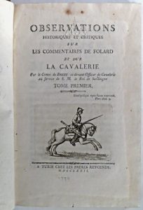 (Hippologie) - BRÉZÉ, comte Argentero de.- Observations historiques et critiques sur les commentaires de Folard et sur la cavalerie. Turin, Frères Reycends, (François Antoine Mairesse), 1772. 2 vol. in-8° : xxiv-327-[1], viii-232 pp. (incomplet...