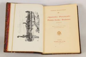 MAISONNEUVE (Thomas) - Aquarelles provençales, pointes-sèches bretonnes. Sonnets - Paris; Maison du Livre, 1910 - 1 volume In-8° - Dessins de Léopold Lelée, d’Arles et de Thomas Maisonneuve hors texte en noir - Reliure de l’époque demi-chagrin brun - Couvertures conservées - Dos lisse orné - Pièce de titre maroquin bordeaux - Bon exemplaire enrichi d’1 envoi autographe signé de l’auteur.