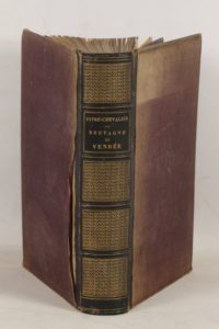PITRE-CHEVALIER - Bretagne et Vendée. Histoire de la révolution française dans l’Ouest (Complément de la Bretagne ancienne et Moderne) - Paris; W. Coquebert, sans date [vers 1880] - 1 volume In-4° - Quelques rousseurs éparses, parfois prononcées, quelques feuillets brunis - Titre frontispice polychrome doré, vignette au titre, 1 carte et 7 planches d’armoiries en couleurs or et argent, illustrations sur acier in et hors texte en noir par MM. A. Leleux, O. Penguilly, T. Johannot - Reliure de l’époque demi-chagrin brun (3 coins émoussés, toile du 1er plat en partie insolé, celle du 2nd en partie décollée) - Joli dos à faux nerfs orné et titré or - Tranches dorées.