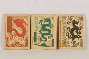 [CHINE] - Médecine et pharmacopée en Chine - Ensemble de 3 plaquettes In-12° reliées par des cordelettes de couleurs sous couvertures illustrées couleurs aux 1ers plats, sous couverture commune libre à rabats éditées par les Laboratoires du Mictasol (sans date) - Frontispices couleurs rehaussés à l’aquarelle - Bon état.