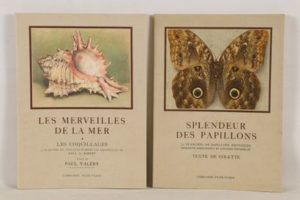 [HISTOIRE NATURELLE] - Ensemble de 2 volumes In-4° brochés sous couvertures à rabats illustrées couleurs aux 1ers platset édités à Paris par Plon en 1936 - VALÉRY (Paul) - Les merveilles de la mer. Les coquillages - 15 planches couleurs hors texte d’après les aquarelles de Paul A. Robert - COLETTE - Splendeur des papillons - 12 planches de papillons exotiques reproduits directement en couleurs naturelles - Très bons exemplaires.
