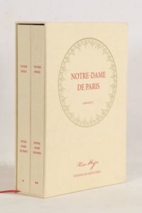 HUGO (Victor) - Notre-Dame de Paris. Manuscrit - Sans lieu; Éditions des Saints-Pères, 2016 - 2 volumes petit In-folio, fac-similé du manuscrit que Hugo rédigea de 1830 à 1831 - Reproductions des gravures d’1 édition de 1882 - Reliure éditeur toile blanche et emboîtage à l’identique, titres en rouge et ornés de la signature fac-similée de l’auteur aux 1ers plats - Très bon exemplaire.