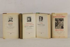 [LA PLÉIADE] - Ensemble de 4 volumes In-12° édités à Paris par Gallimard, NRF, collection La Pléiade - GOETHE - Théâtre complet - LAUTRÉAMONT - NOUVEAU (Germain) - Œuvres complètes - CLAUDEL (Paul) - Théâtre (tome I) - SAINT-EXUPÉRY (Antoine de) - Œuvres - Reliures éditeur chagrin, sous jaquettes et rhodoïds - Bon état général.