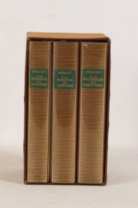 [LA PLÉIADE] - PROUST (Marcel) - A la recherche du temps perdu (tomes I à III) - Paris; Gallimard, NRF, collection La Pléiade - 3 volumes In-12° - Reliure éditeur chagrin, sous jaquettes, rhodoïds (fente partielle au dos du rhodoïd du tome III), et emboîtage commun de suédine havane - Bon état.