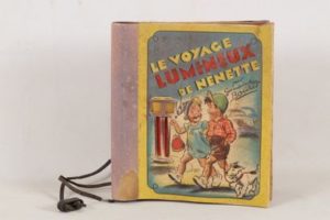 [LIVRE-OBJET - ENFANTINA] - BOURET (Germaine) - Le voyage lumineux de Nénette - Monte-Carlo; Éditions Les Flots Bleus, 1950 - 1 album In-8° sous couverture illustrée couleurs (légèrement salie, 1 auréole au 1er plat) - Illustrations in et hors texte en couleurs par Germaine Bouret, certaines sur papier calque de couleurs permettant les éclairer le 1er plat et les planches par le système électrique en 220 volts contenu dans le dos de l’album et relié par 1 prise électrique (fils dénudés par endroits, système électrique non fonctionnel, à revoir) - Étui illustré couleurs manquant - Peu courant.