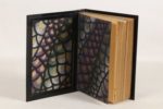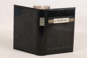 [RELIURE JOTAU] - BENOIT (Pierre) - L’Atlantide - Paris; Albin Michel, [1930] - 1 volume In-8° - Quelques rares rousseurs éparses - Reliure Art-Déco en bakélite noire Jotau brevetée S.G.D.G. avec au 1er plat, jeu de rainures horizontales et pièce de métal titrée incrustée, charnières articulées, plats biseautés - Contre plats et gardes de papier décoré vert, violet, or, argent et noir - 1ère couverture conservée - Dos lisse titré sur plaque métallique incrustée - Tête dorée - Discret ex-dono manuscrit à la 2nde garde blanche - Très belle reliure industrielle en bakélite. Objets d'un véritable engouement dans les années 1930, le coût de fabrication élevé de ces reliures interdit cependant leur développement et elles sont restées rares.