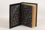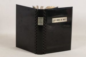 [RELIURE JOTAU] - DORGELÈS (Roland) - Les croix de bois - Paris; Albin Michel, 1930 - 1 volume In-8° - Des rousseurs éparses - Reliure Art-Déco en bakélite noire Jotau brevetée S.G.D.G. avec au 1er plat, jeu de rainures horizontales et pièce de métal titrée incrustée, charnières articulées, plats biseautés - 1ère couverture conservée - Contre plats et gardes de papier décoré vert, violet, or, argent et noir - Dos lisse titré sur plaque métallique incrustée - Tête dorée - Discret ex-dono manuscrit à la 2nde garde blanche - Bon exemplaire - Très belle reliure industrielle en bakélite. Objets d'un véritable engouement dans les années 1930, le coût de fabrication élevé de ces reliures interdit cependant leur développement et elles sont restées rares.