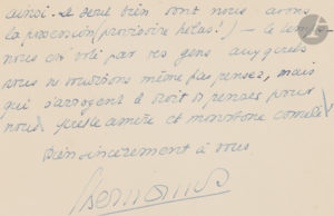 « Je suis si touché de trouver votre affectueuse et fidèle pensée à chaque petit tournant de ma vie ! Est-ce bête de ne pas avoir encore été vous serrer la main ! Mais il en est toujours ainsi. Le seul bien dont nous avons la possession (provisoire hélas !) – le temps – nous est volé par des gens auxquels nous ne voudrions même pas penser, mais qui s’arrogent le droit de penser pour nous. Quelle amère et monotone comédie ! »...