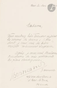 Bernanos, qui séjourne alors à Bar-le-Duc (47 rue des Ducs) envoie de l’argent (loyer ou remboursement d’une dette ?) à sa correspondante. Le 22 mai 1925 (en-tête des assurances La Nationale), de Châlons, il promet d’envoyer des fonds dès son retour à Bar-le-Duc. Une autre fois, il envoie la somme de 750 F et explique : « Ce n’est que la moitié de celle que je devrais vous remettre, et je vous serais très obligé de bien vouloir prier Madame Délepine de s’en contenter pour cette fois. Elle peut croire que j’enverrai le solde aussitôt qu’il me sera possible »…