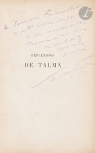 Sacha GUITRY (1885-1957). — François TALMA. — Réflexions de Talma sur Lekain et l’art théâtral (Paris, Auguste Fontaine, 1856). In-16, broché (dos abîmé).