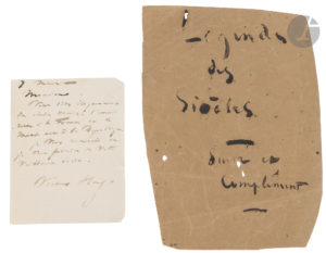 On joint une note autographe sur papier brun, ayant probablement servi comme couverture d’un dossier : « Légende des Siècles – Suite et complément » (environ 23 x 16,5 cm).