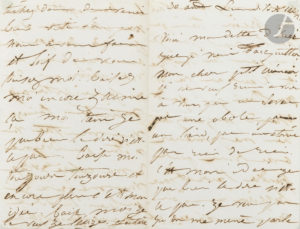 [Victor HUGO]. Juliette DROUET (1806-1883). — L.A.S. « Juliette », 30 août Lundi soir [1841 ?], à Victor Hugo ; 4 pages in-8 (sous verre). — Amusante lettre amoureuse.